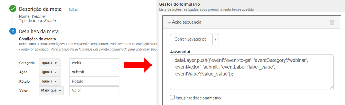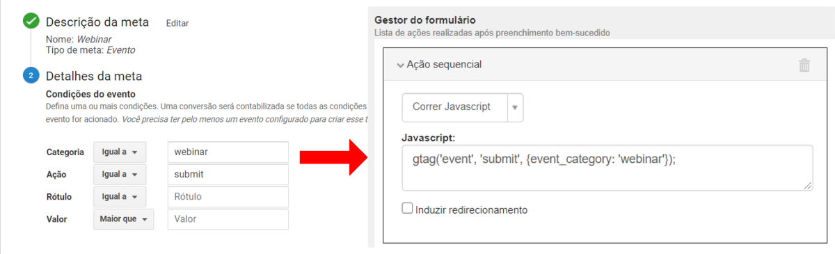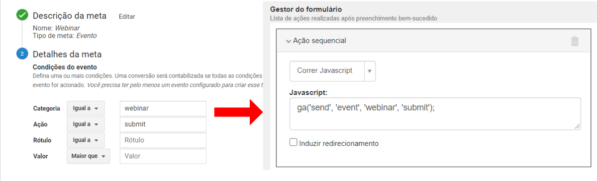 Rastrear eventos pode ajudá-lo a ver como os usuários interagem com o seu conteúdo. Quando um visitante do site ou usuário do aplicativo executar uma ação que foi identificada como uma meta, o Analytics registrará uma conversão. Você pode adicionar o código de monitoramento de eventos nas configurações do controlador de formulários via "Ação personalizada" → "Chamar Javascript", que deve ser definido para o primeiro lugar no controlador.