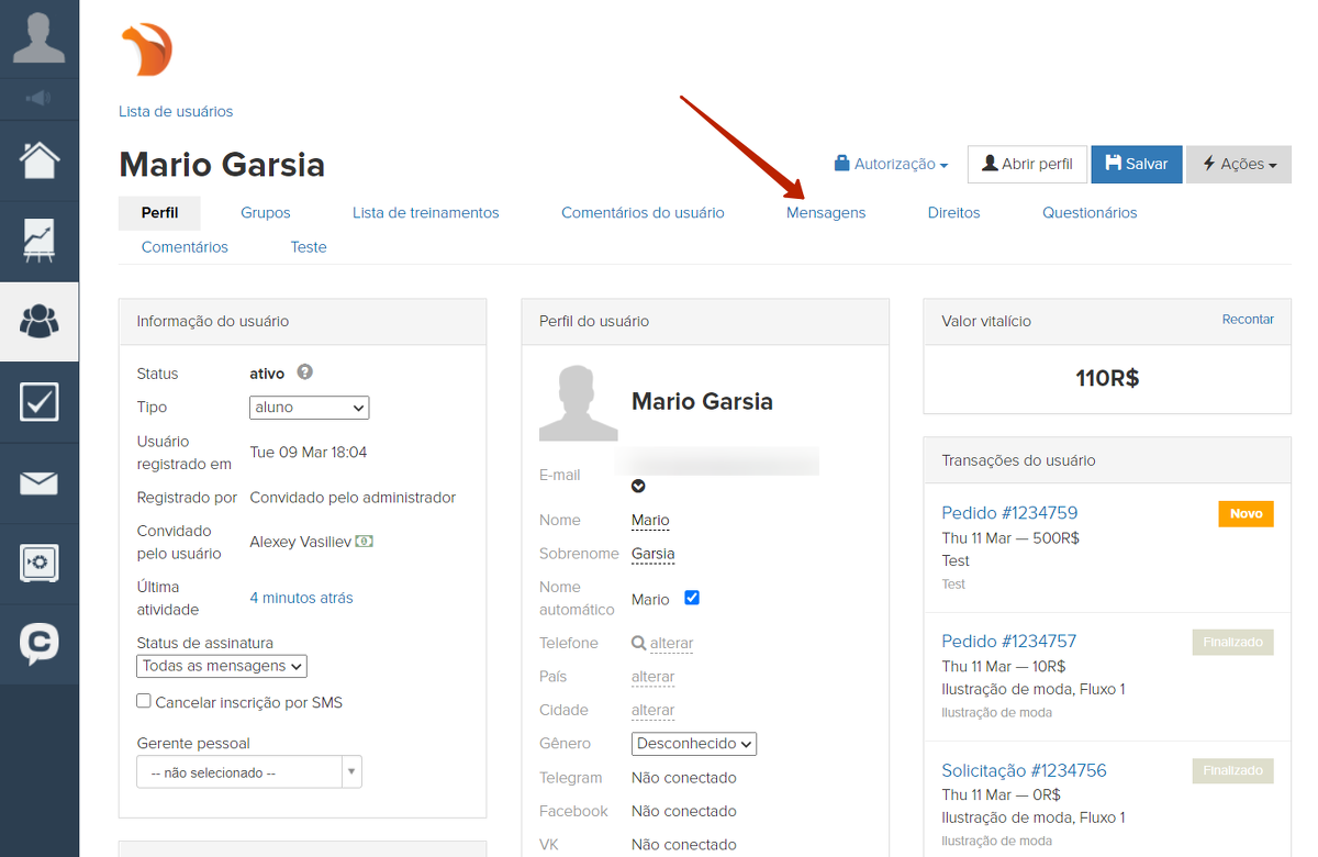 Se você acessar o perfil do usuário, na aba "Mensagens", poderá ver todas as correspondências e notificações enviadas a ele e sua reação a eles.