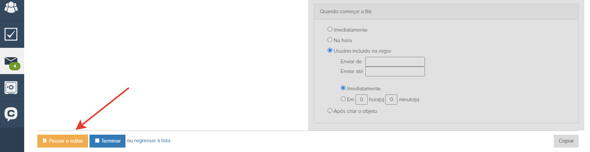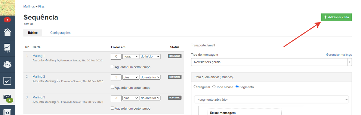 Ou seja, se você adicionar um ou mais e-mails no meio da sequência e já tiver um usuário que recebeu o e-mail subsequente, os e-mails adicionados serão enviados imediatamente.