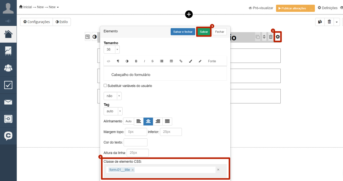 - Insira uma classe semântica na caixa de tags, em inglês, por exemplo: form-01__title, form-01__text, form-01__btn, etc.