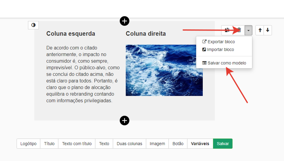 Aliás, qualquer bloco — título, texto, imagem, botão — também pode ser salvo como modelo e inserido posteriormente nas suas mensagens.