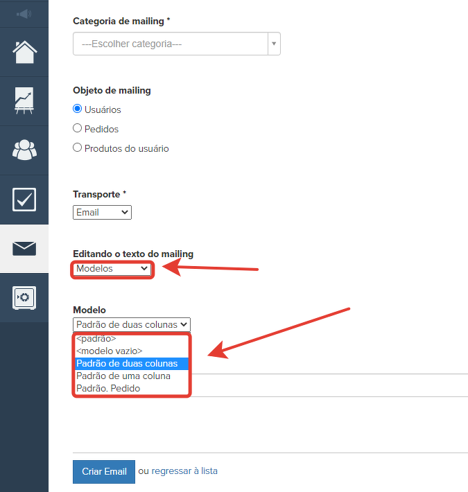 Por padrão, a nova mensagem será criada no editor de textos antigo. Para criar uma mensagem no editor novo, selecione "Modelos" na linha "Edição de texto da lista de e-mail".