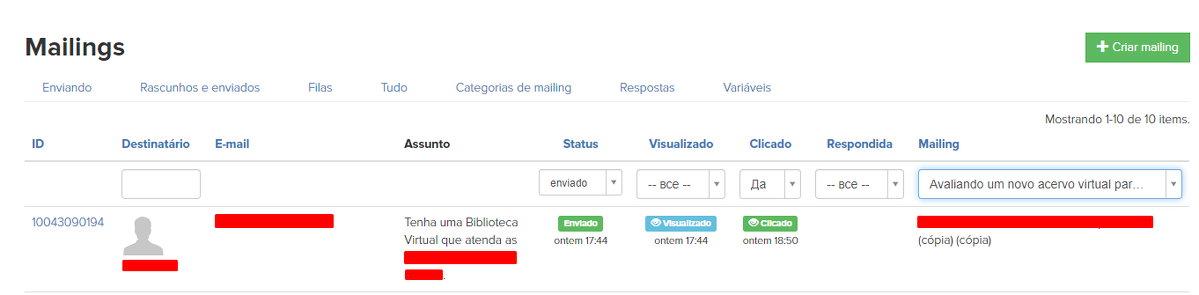 Оbserve que para selecionar usuários que visualizaram uma lista de e-mails específica, você deve especificar os parâmetros em um bloco "Mensagem enviada".