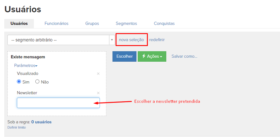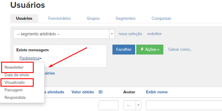 A segunda forma é acessar a seção "Usuários" e selecionar o segmento daqueles que receberam a mensagem de uma lista de e-mails específica e a visualizaram.