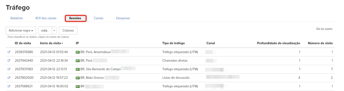 Para procurar e visualizar as sessões, acesse a aba "Site"->"Tráfego"->"Sessões".