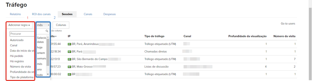 Você pode usar qualquer combinação dos filtros disponíveis (1) para encontrar apenas as sessões de seu interesse e também selecionar o período para o qual deseja receber os dados (2).