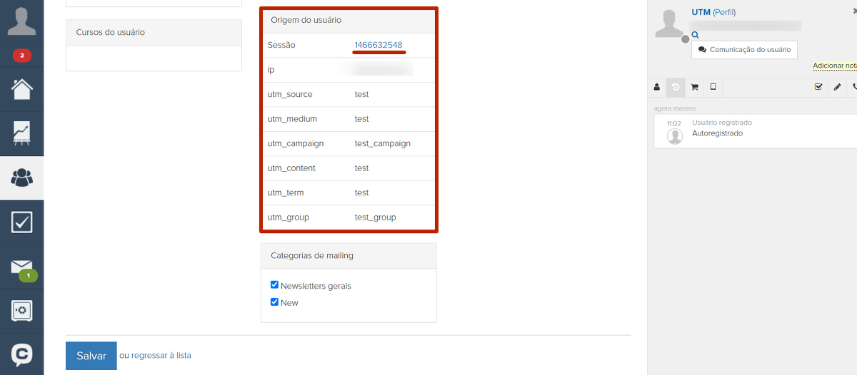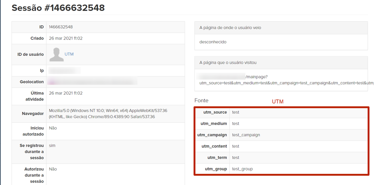 Na origem, são exibidas as tags UTM e outros parâmetros que estavam no link utilizado pelo usuário para acessar o site e cadastrar-se: