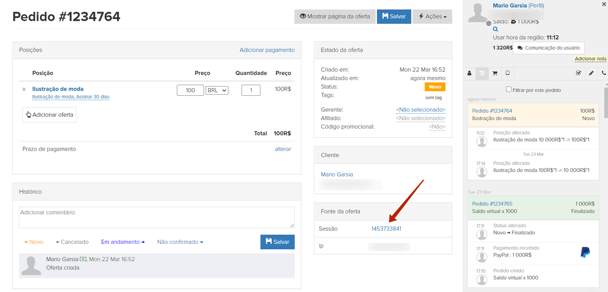 A origem do pedido é exibida no cartão do pedido: