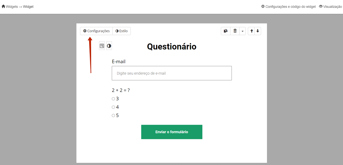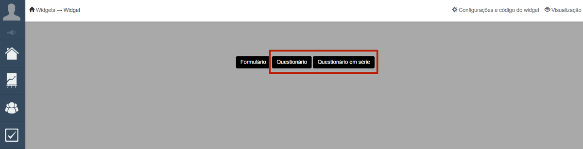 No widget, é necessário adicionar o bloco "Formulário" - "Questionário":