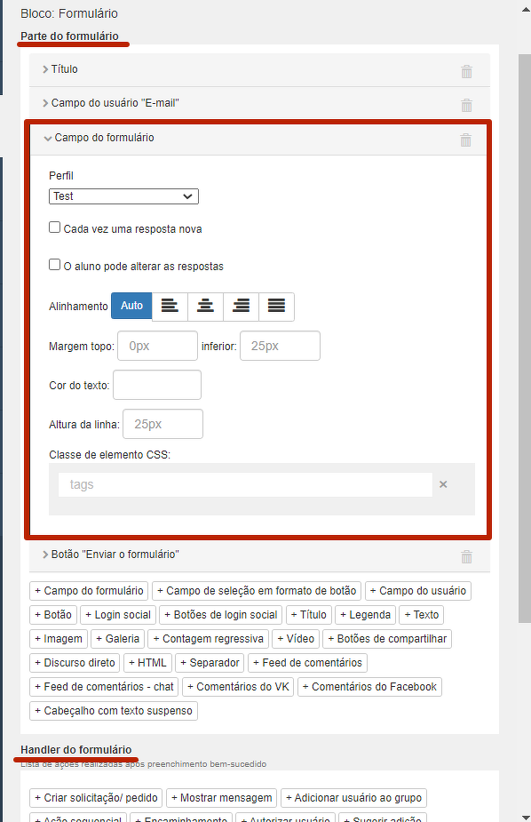 Nas configurações do bloco, na seção "Partes do questionário", selecione qual questionário deve ser conectado ao bloco. Na seção "Controlador do formulário", configure as ações que deverão ser executadas após o seu preenchimento.