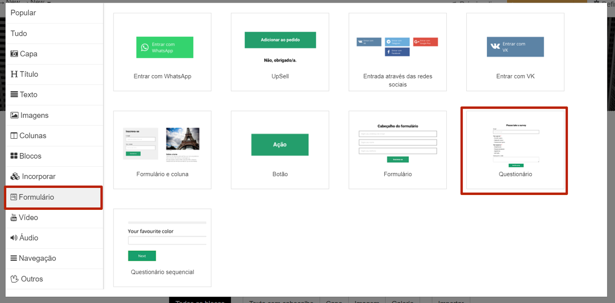Depois que o questionário for criado, você pode adicioná-lo à página. Para isto, coloque o bloco "Questionário":