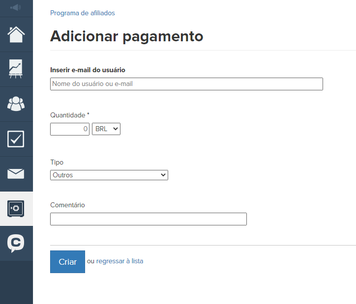 No menu "Vendas" - "Programa de afiliados", na aba "Pagamentos", você adiciona a informação de pagamento do afiliado, selecionando o tipo de pagamento e fornecendo o e-mail dele. Os dados são registrados e ficam disponíveis na conta do afiliado. Você também pode deixar comentários sobre como e quando o pagamento foi realizado.