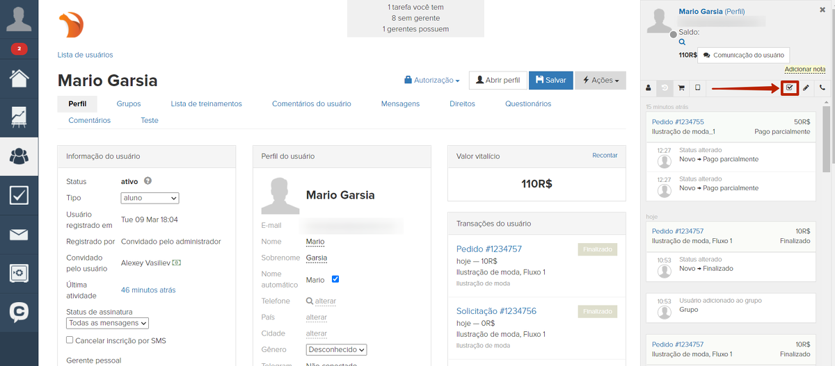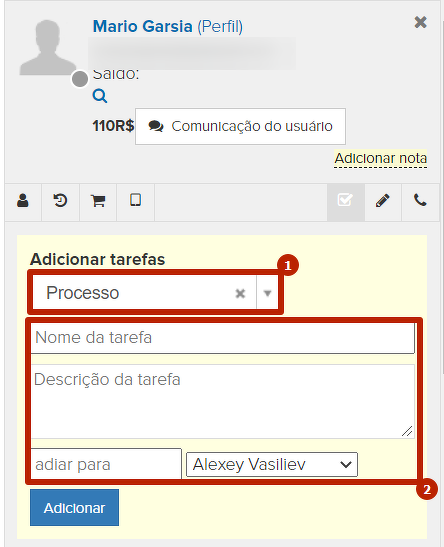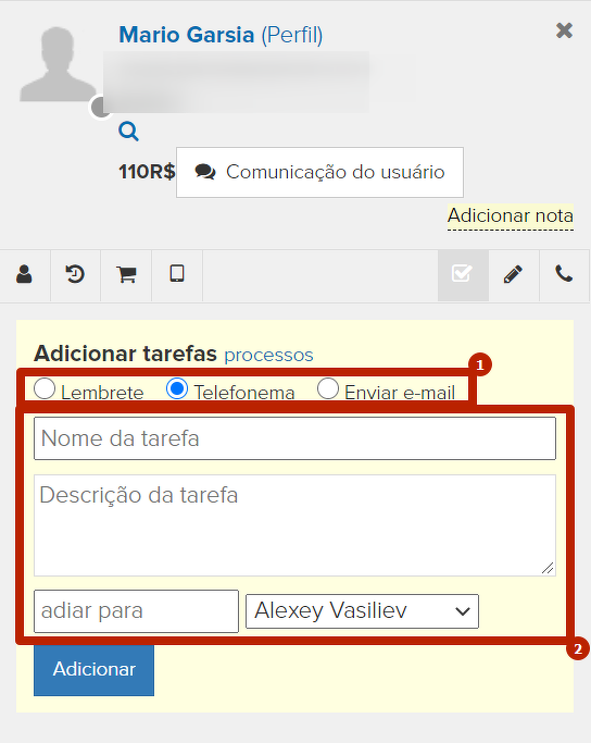 No cartão do usuário, é possível determinar manualmente uma tarefa por usuário, por exemplo, que é necessário ligar pra ele e confirmar se ele vai pagar ou não o pedido ou enviar uma determinada mensagem: