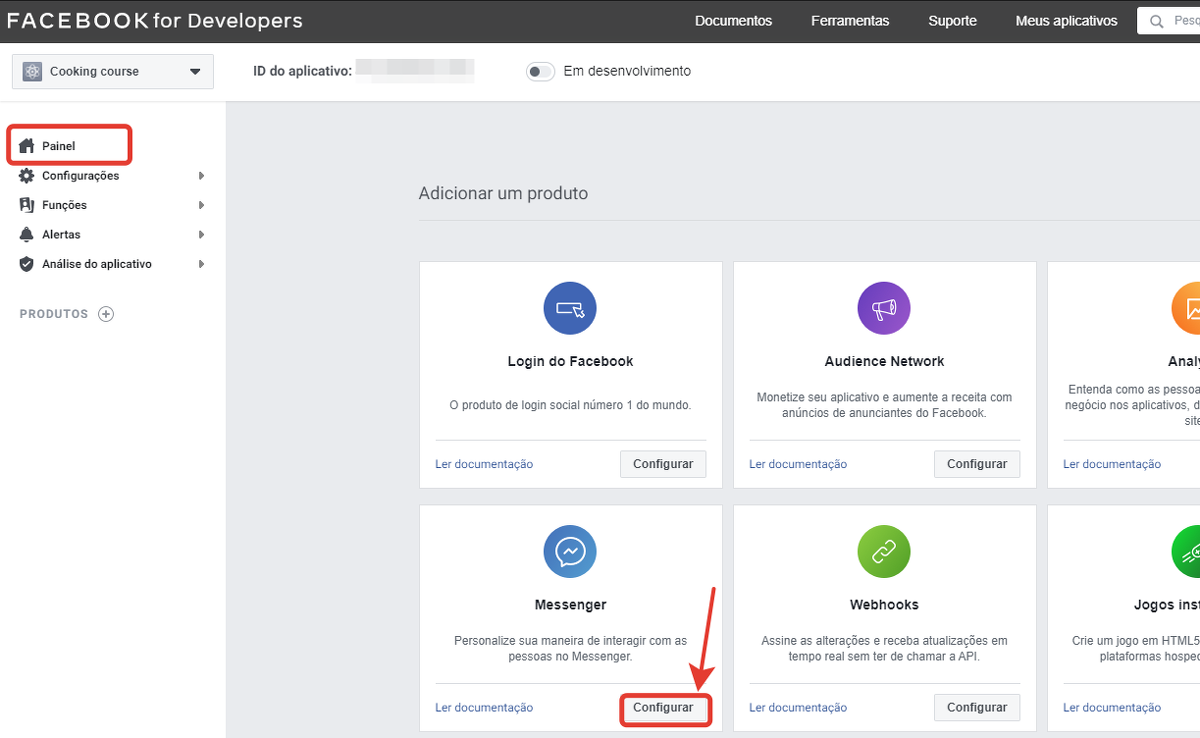 Abra a página "Painel" no seu aplicativo. Na seção "Adicione um produto", vamos selecionar o bloco "Messenger" - "Configurar"