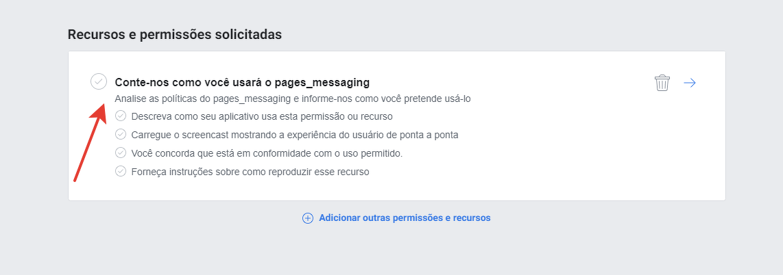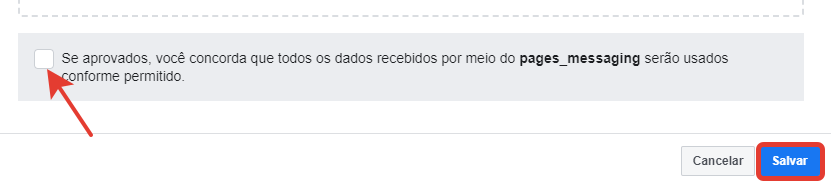 4) Depois de adicionar o screencast, você precisa confirmar seu consentimento para usar "pages_messaging" da maneira permitida e salvar as alterações:
