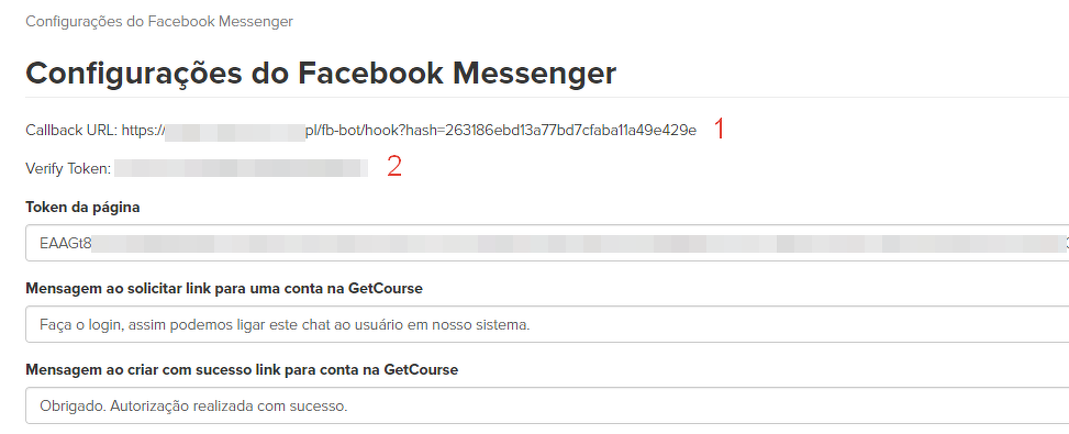 Inserimos o marcador de acesso copiado anteriormente no campo "Token da página" na GetCourse, na seção "Mensagens" - "Configurações" - "Notificações" - "Configurações do Facebook Messenger":
