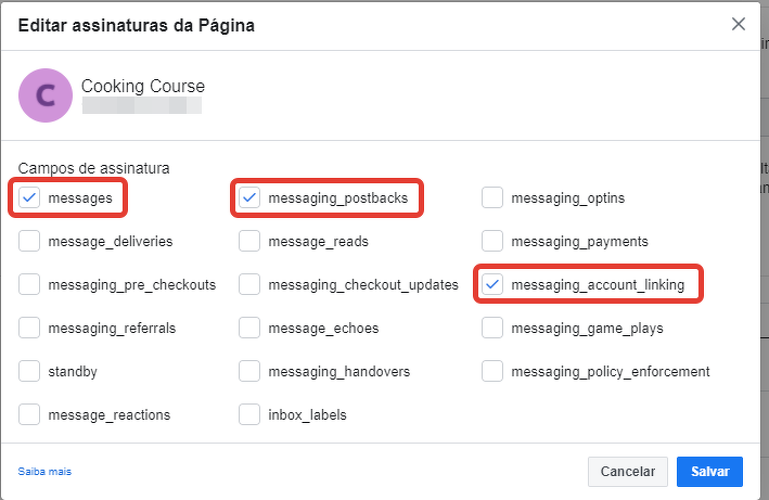 Na janela que será aberta, marcamos os itens: messages, messaging_postbacks e messages account linking.