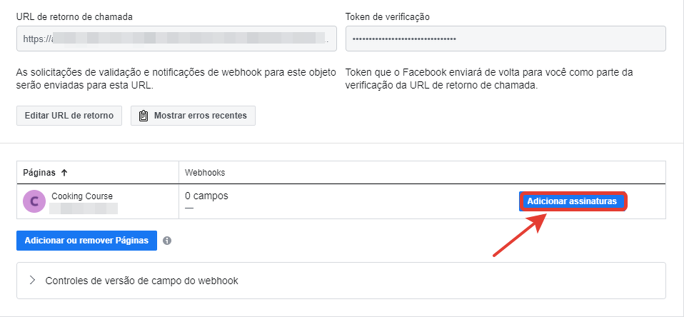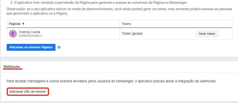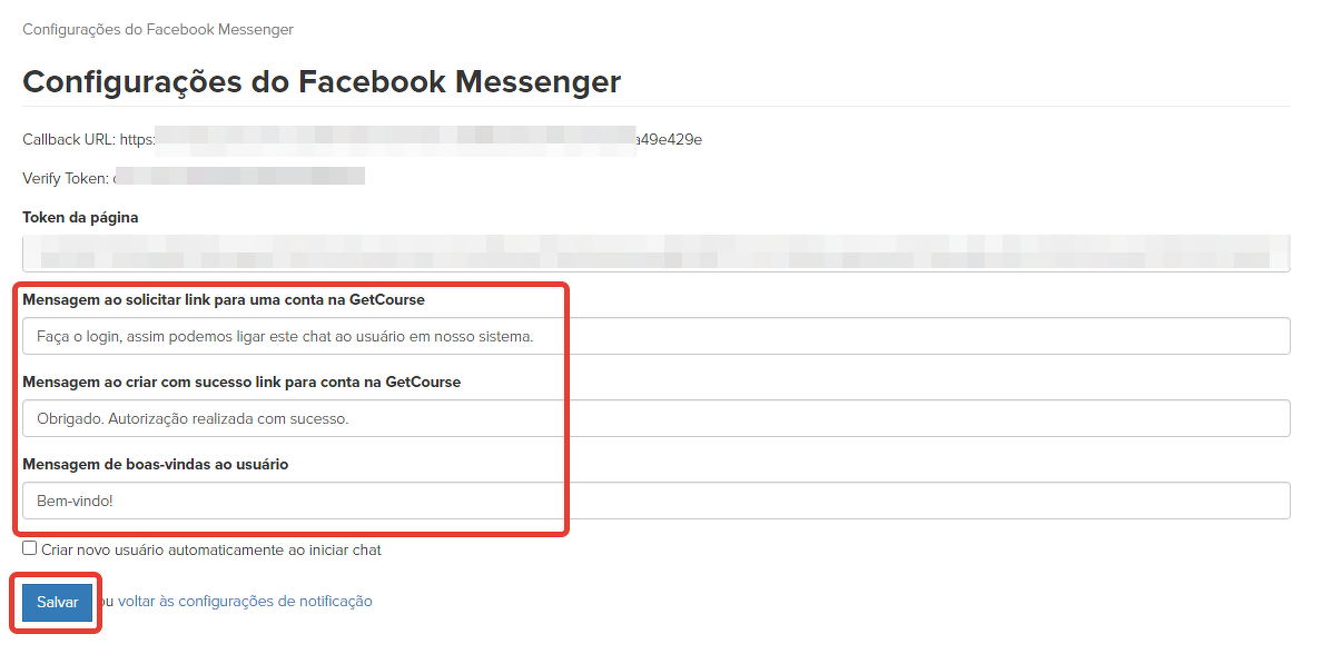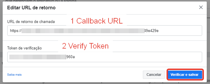 Vamos preencher o campo da URL de retorno (que corresponde ao campo "Callback URL" na GetCourse) e confirmar o marcador (que corresponde ao campo "Verify token").
