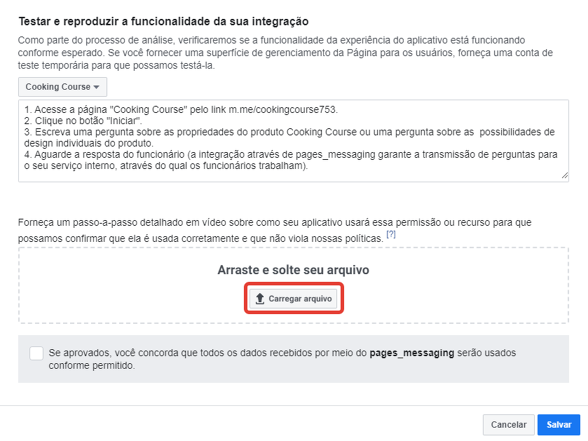 Atenção: a screencast pode ser gravada pelo dono ou administrador do aplicativo, já que até o envio do aplicativo para a verificação, só eles podem testar o funcionamento da integração na página m.me/nome_dasua_página_Facebook.