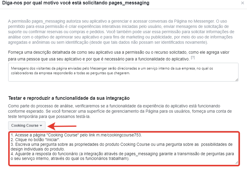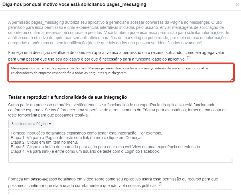 1) No campo “Diga-nos porque está a solicitar a função“ pages_messaging ””, pode especificar que as mensagens dos visitantes das páginas escritas no Messenger serão enviadas para o serviço interno da sua empresa, onde os colaboradores desta empresa responderão às perguntas que chegarem.