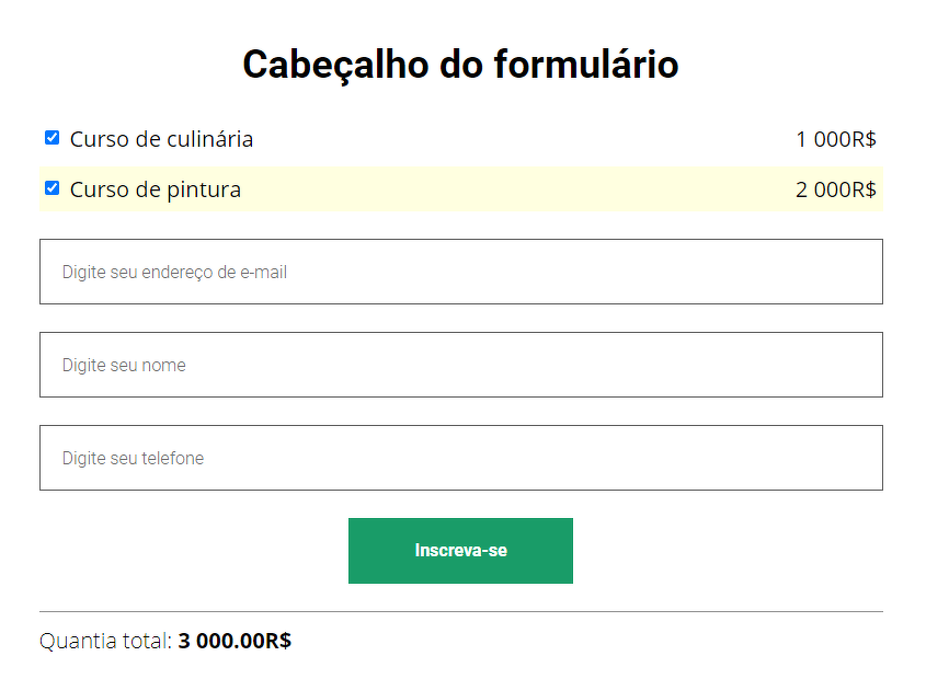 Se você adicionou uma certa quantidade de ofertas ao seu formulário, você tem a possibilidade de exibir o valor total das que foram selecionadas pelo usuário.