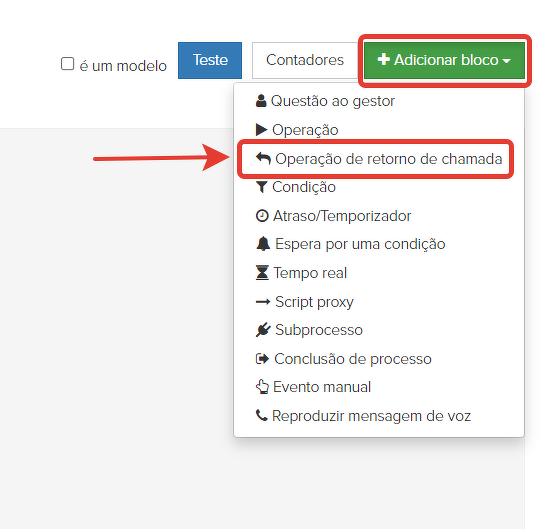 Para organizar a interatividade dos processos, é necessário selecionar o bloco "operação de callback" e indicar as opções de respostas para os usuários.