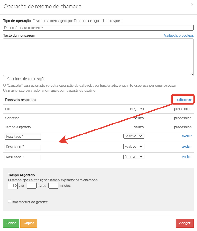 Importante: por condições do Facebook, não é possível enviar mais do que três opções de resposta em uma operação de callback.