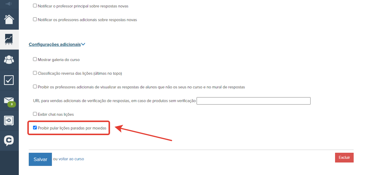 Se necessário, você pode proibir pular aulas pausadas por meio do pagamento com moedas nas configurações do curso.