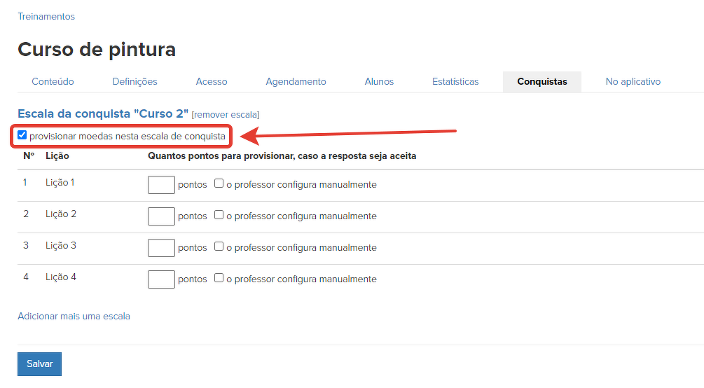 1. Você pode distribuir moedas pela participação nas aulas, juntamente com os pontos de acordo com a escala de conquistas.
