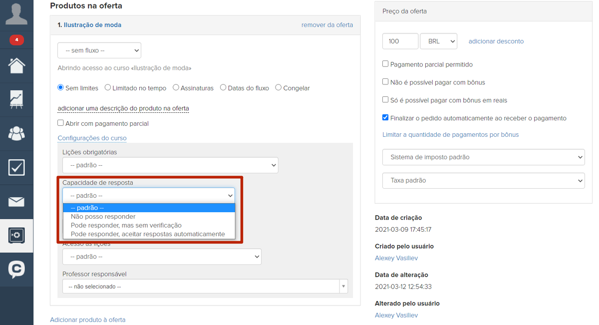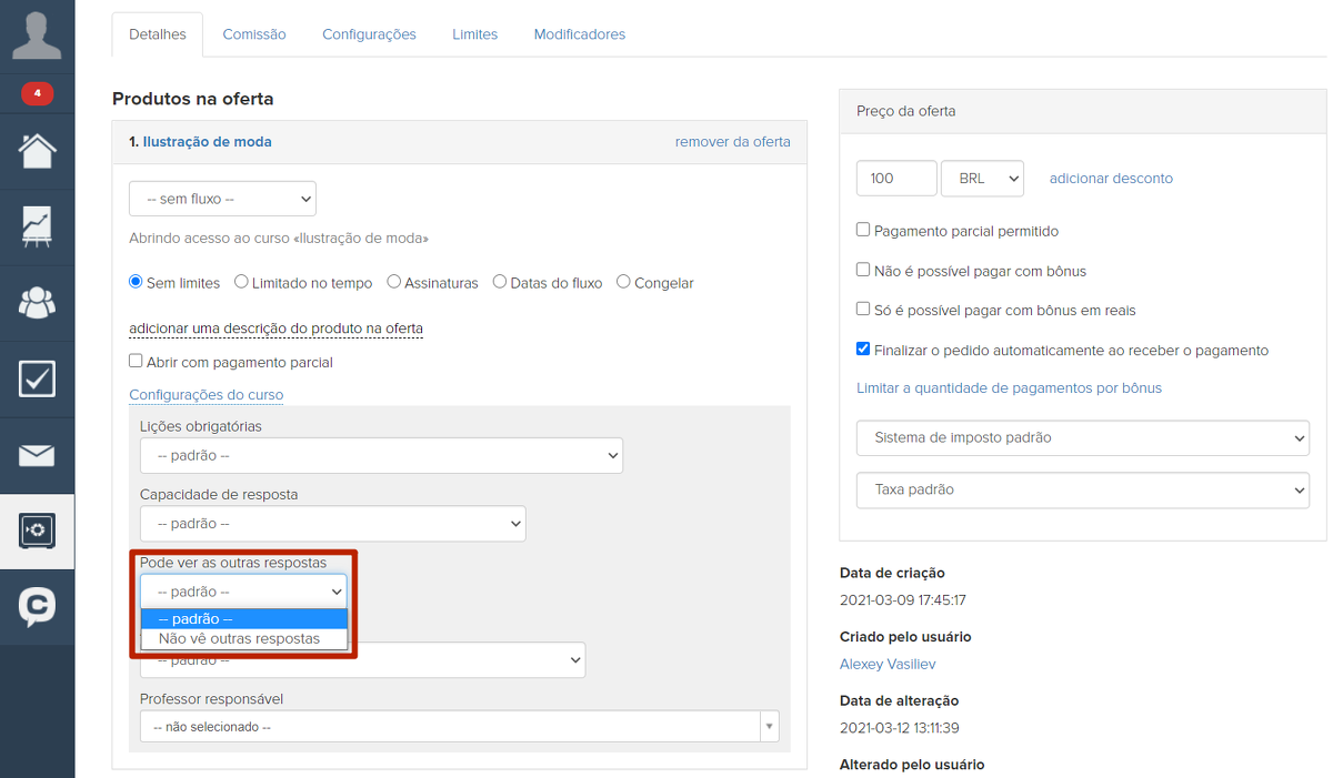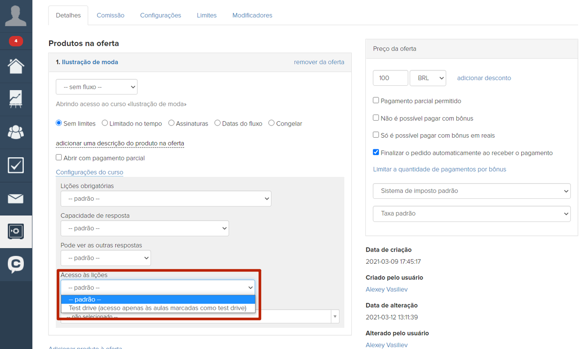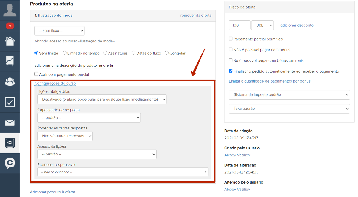 Para usar essa funcionalidade, você precisa fazer configurações especiais na oferta. Eles se tornam disponíveis se o acesso ao curso for especificado no produto.