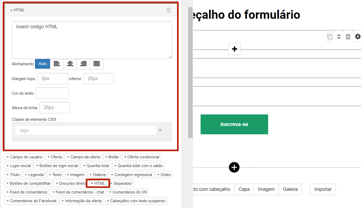 Quer adicionar um layout personalizado ao seu formulário? Selecione "HTML" nas configurações do bloco de formulário. Insira o código HTML no campo.