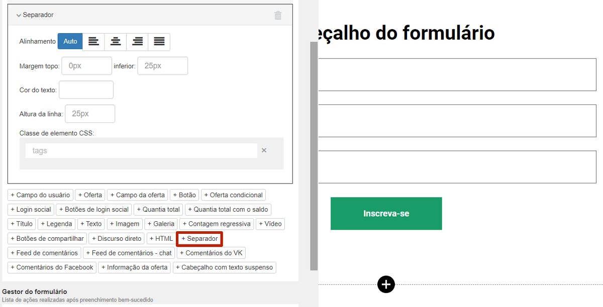Você pode dividir visualmente o conteúdo em um formulário usando uma linha separadora. Nas configurações do bloco, selecione a função "Separador", você pode definir a cor e o alinhamento da linha.