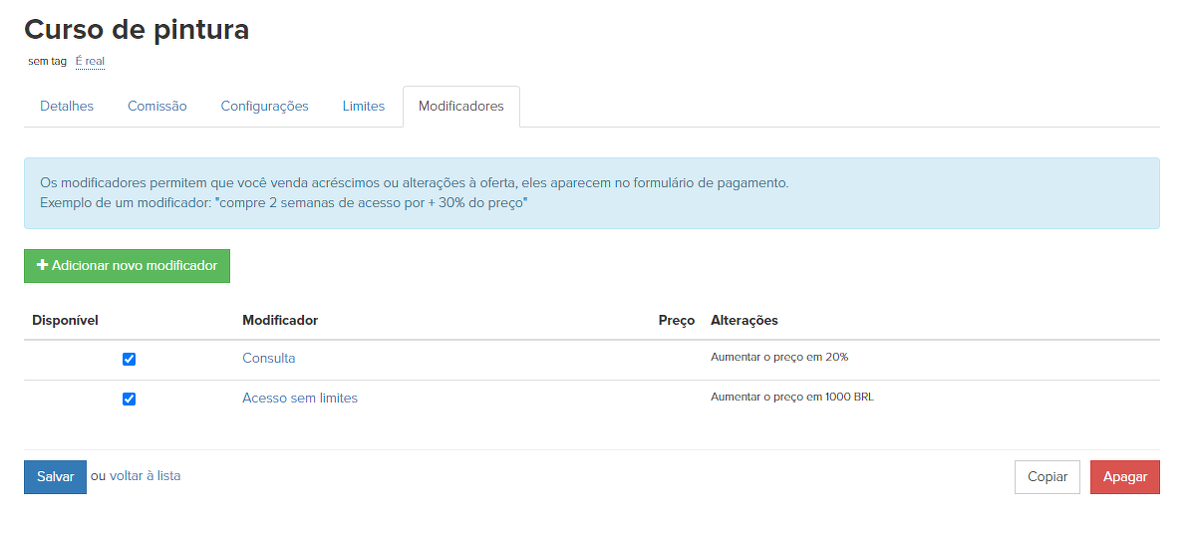Há também uma aba "Modificadores" nas configurações de uma oferta específica, com a ajuda dela você pode especificar quais modificadores são aplicados em uma oferta específica.