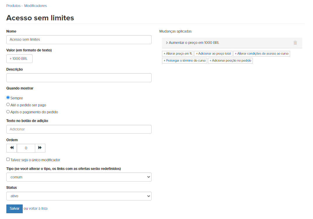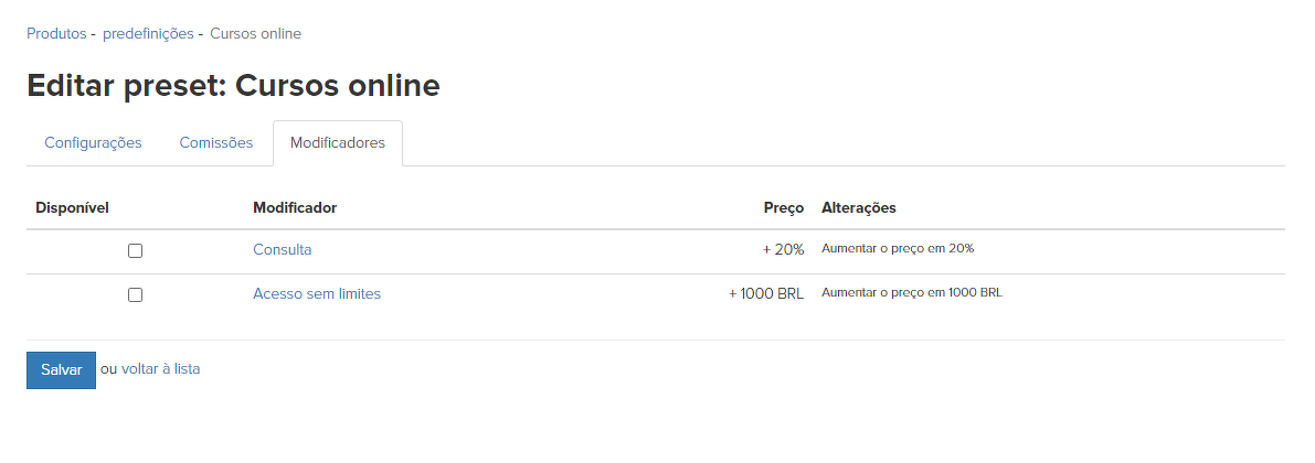 Para não especificar um conjunto de modificadores separadamente em cada oferta, você pode especificá-lo em uma predefinição. Por exemplo, crie uma predefinição "Cursos online" para os quais um conjunto de modificadores está disponível e "Cursos offline" para os quais o conjunto será diferente.