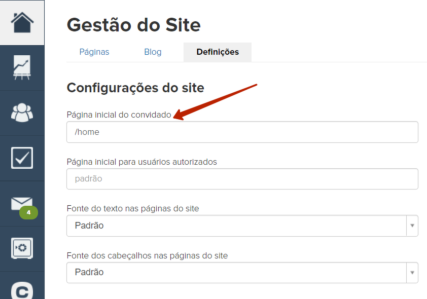 Para alterá-los, digite o endereço da página que deseja transformar em página principal. Por exemplo, a landing /home.