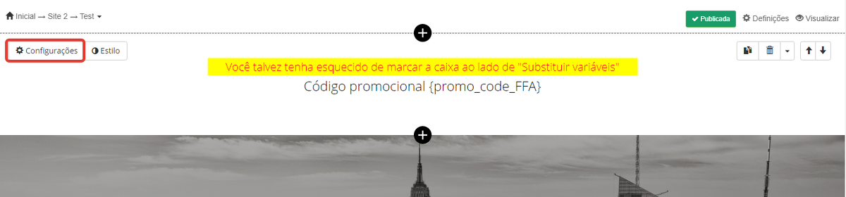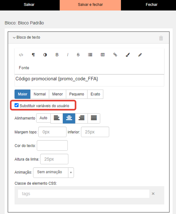 Um código promocional pode ser emitido em qualquer página, fazendo uma substituição no bloco de texto {promo_code_prefix} e marcando a caixa de seleção "Substituir variáveis". Cada usuário verá sua própria versão do código promocional na página, que parecerá assim: "FFA_código único".