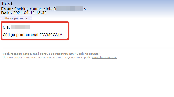 Por exemplo, em nosso caso, a substituição seria {promo_code_FFA}. O usuário verá o código promocional no seguinte formato: "FFA_código único".