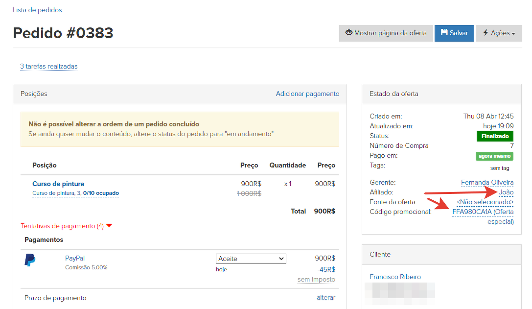 O proprietário do código de parceria compartilha o código com outras pessoas, que, por sua vez, inserem esse código durante a finalização da compra e recebem um desconto, e o proprietário do código se torna um parceiro neste pedido (e é registrado no programa de parceiros) e a remuneração acordada é creditada a ele.