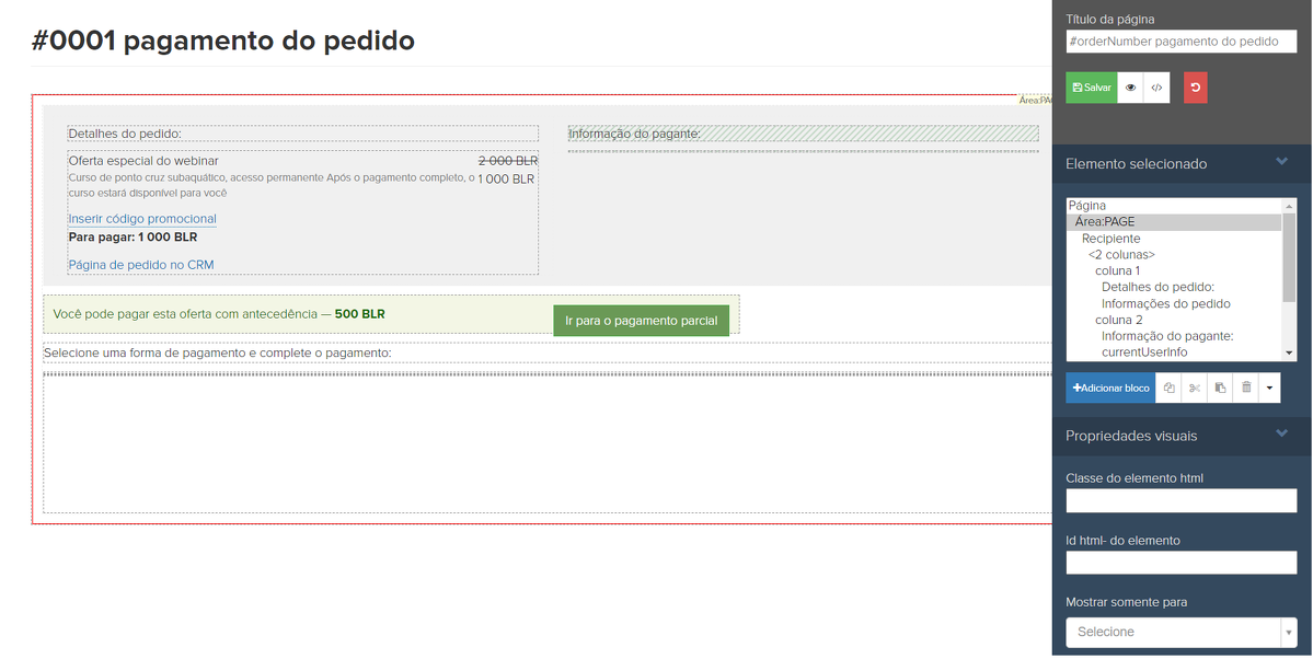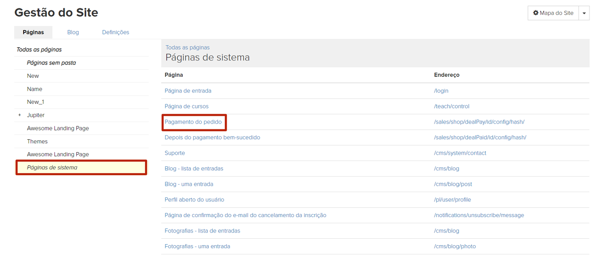 Para alterar as configurações da página do sistema de pagamento, selecione a seção "Páginas do sistema" - "Pagamento do pedido" no menu "Site".