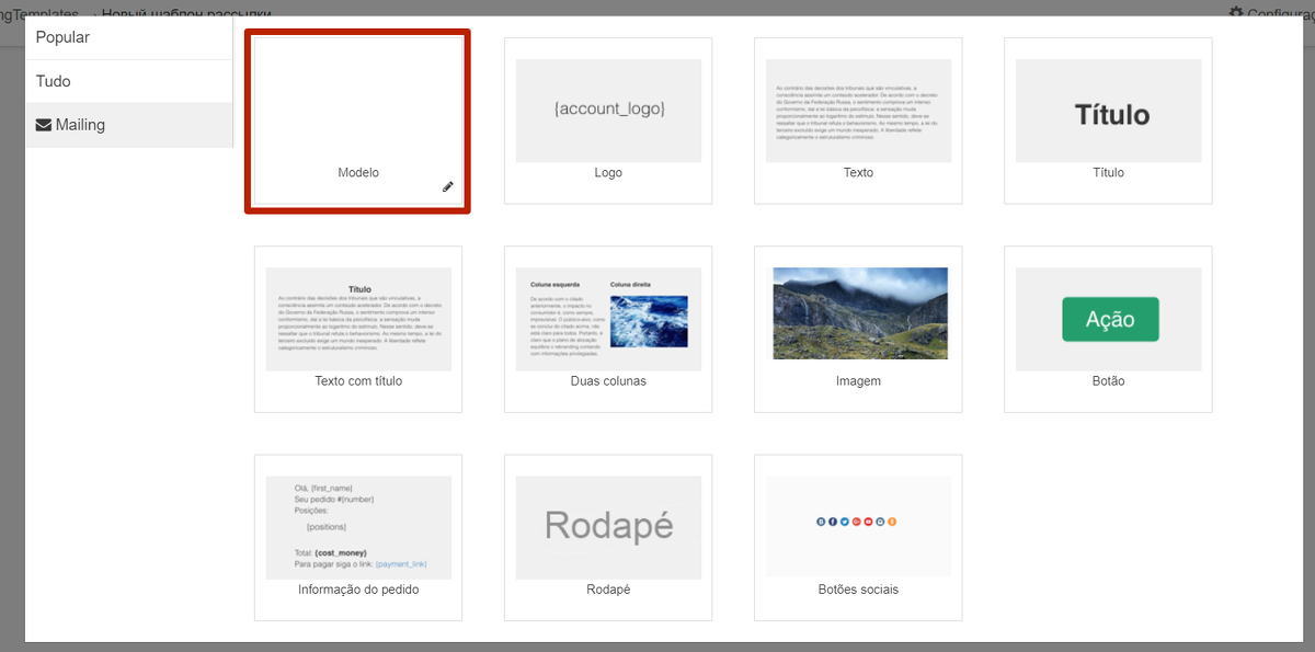 Há layouts de mensagens prontos. Você pode escolher um layout com uma ou duas colunas, bem como um layout de “Pedidos” com as variáveis necessárias definidas previamente.