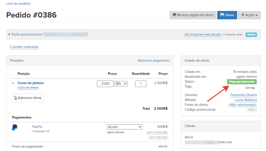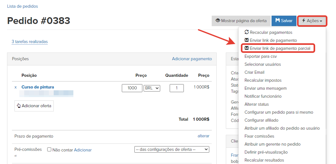 Para fazer isso, acesse o cartão do pedido e clique no botão "Ações" - "Enviar link para pagamento parcial". Depois disso, especifique o valor do pagamento parcial que o usuário terá que fazer: