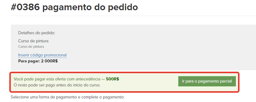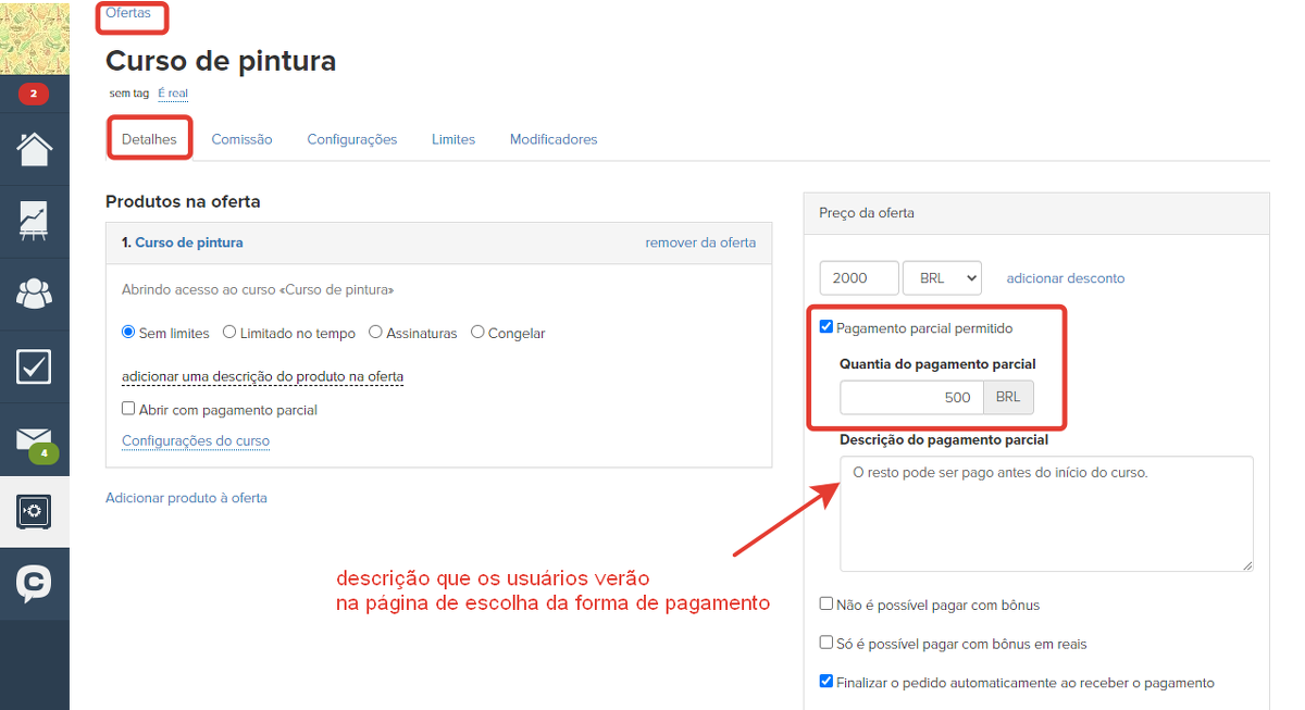 - marcar, na oferta, a caixa "Pagamento parcial permitido",