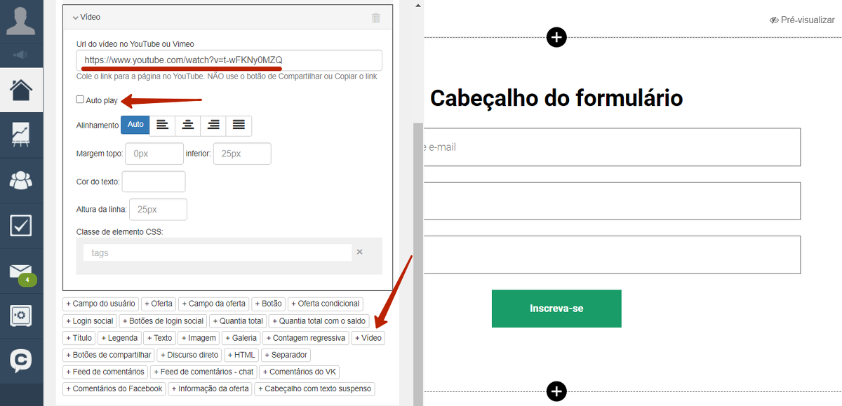 Como alocar um vídeo promocional do Youtube ou Vimeo no formulário? Nas configurações do bloco do formulário, adicione a opção "Vídeo" e, no campo correspondente, insira o link para o vídeo. Se necessário, defina a reprodução automática para o usuário marcando a caixa "Reprodução automática".
