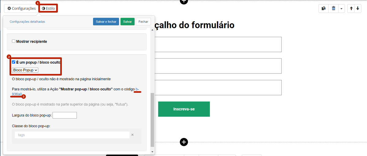 Na aba "Estilos" do bloco de formulário, especifique "É um popup / bloco oculto".