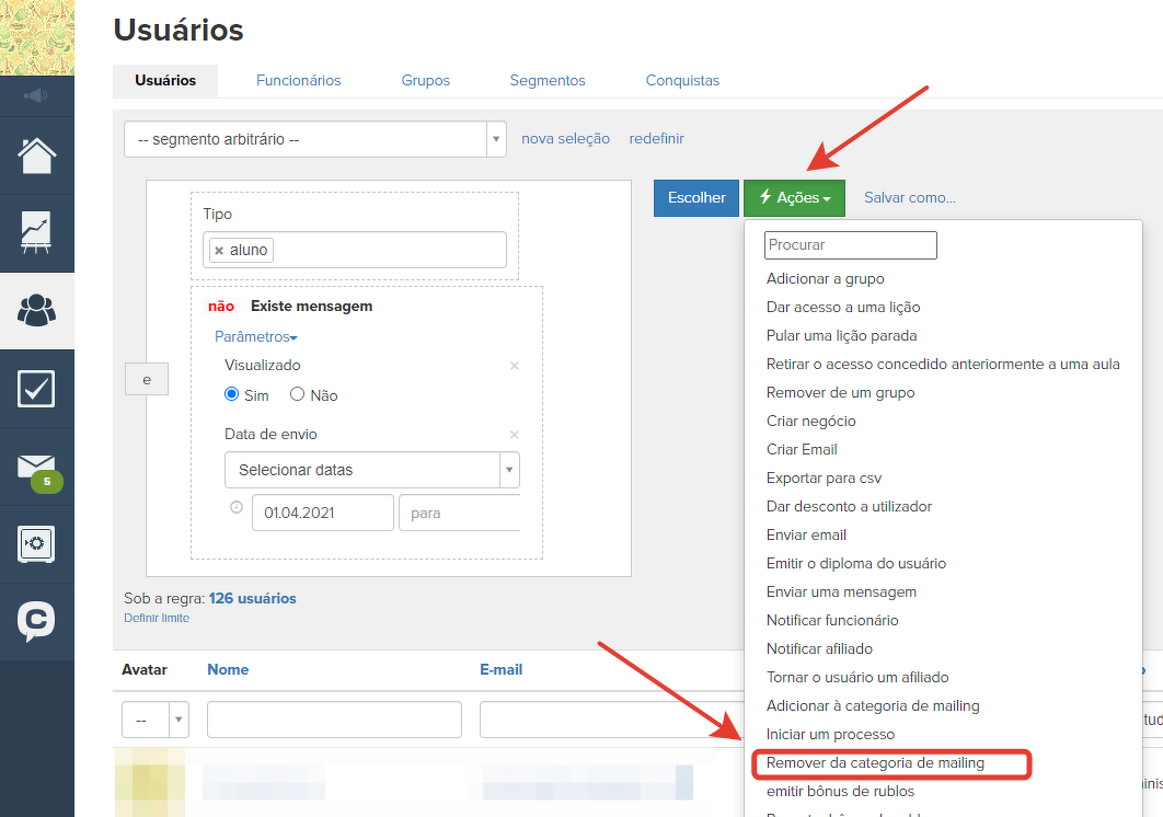 Você pode cancelar em massa a inscrição de usuários em newsletters selecionando um segmento adequado clicando em "Ações" - "Remover da categoria de correpondências":