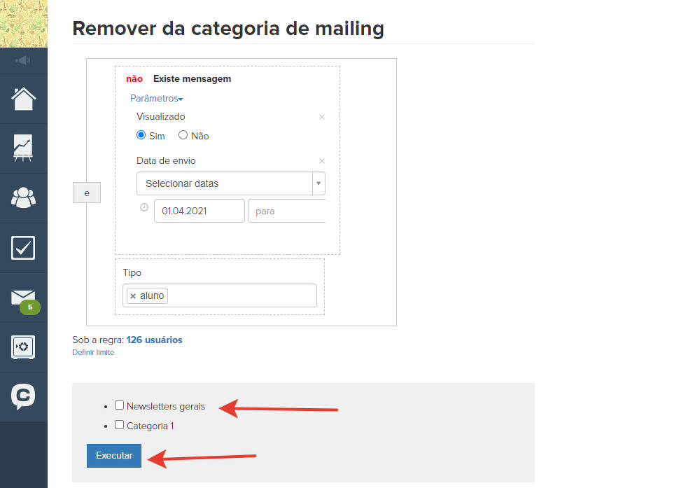 Em seguida, marque todas as categorias de correspondências nas quais deseja cancelar as inscrições de usuários (por exemplo, "Correspondências em geral") e clique em "Executar":