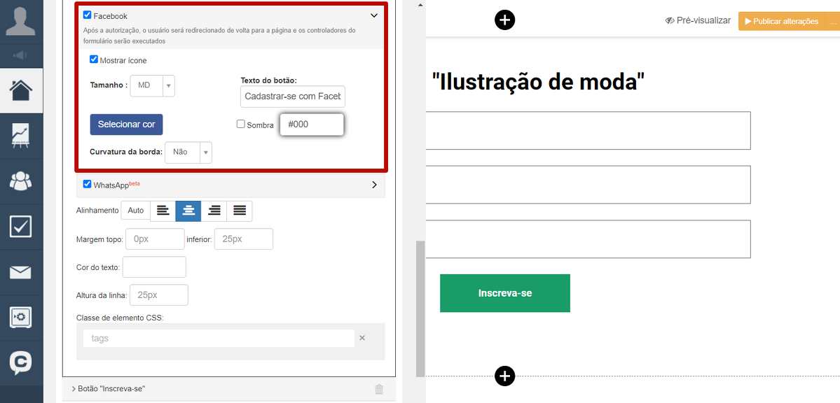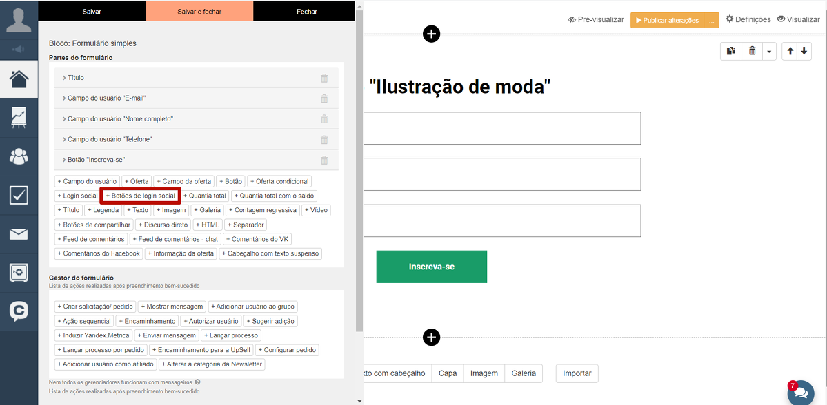 É possível se autenticar não apenas na página de Login/Cadastro, mas também através do formulário na página de destino. Para isso, selecione o bloco "Botões de login via redes sociais" nas configurações do formulário.