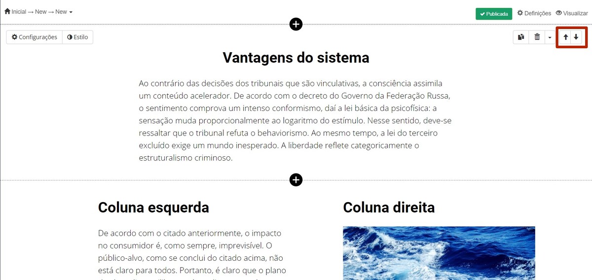 Para mover um bloco, você precisa clicar no botão ↓ ↑ do lado direito do bloco e, mantê-lo pressionado para mover o bloco para o local desejado na página.