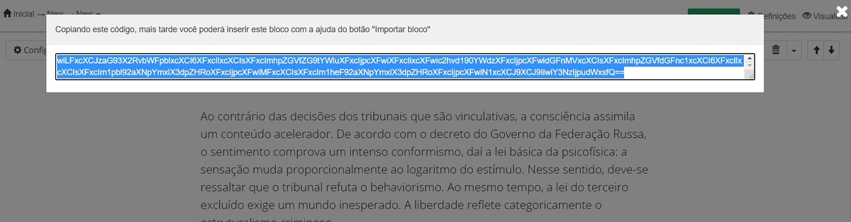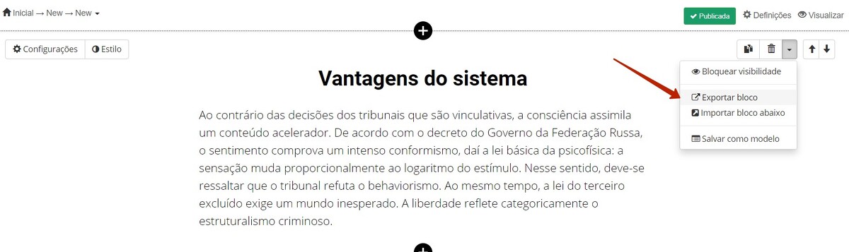 Em vez de criar um novo bloco do zero, você pode criar um bloco semelhante com os parâmetros já salvos. Para isso, clique em "Exportar bloco" no menu suspenso à direita, copie o código recebido e cole-o no bloco desejado clicando no botão "Importar bloco abaixo".