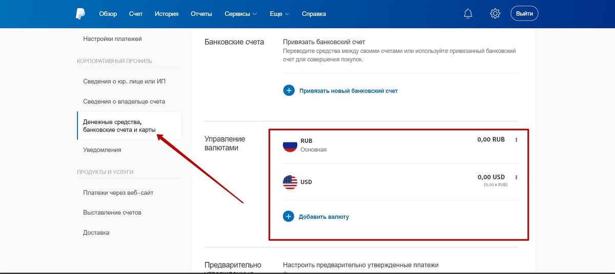 Se a sua conta principal não é em rublos ou se você vai aceitar pagamentos em diferentes moedas, é necessário configurar as moedas na seção "Fundos, contas bancárias e cartões"